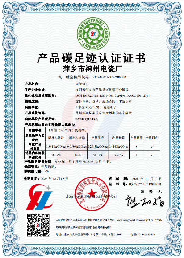 【公示】萍乡市神州电瓷厂产品碳足迹认证证书(监督1)